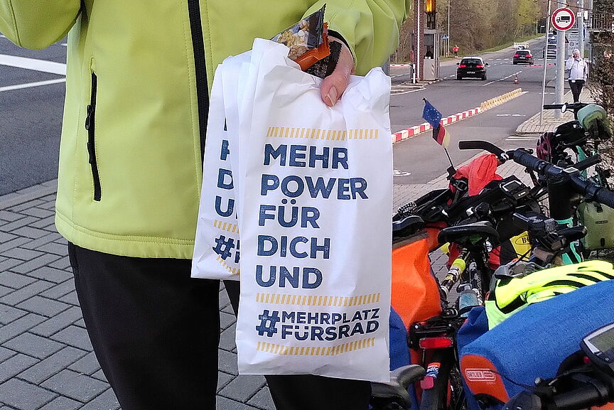 Als Überraschung bekamen die ca. 100 Radler:innen - Radtourteilnehmende und "Normalradpendelnde"- Frühstücksbrötchen und Müsliriegel von Aktiven des ADFC-Wolfsburg überreicht.