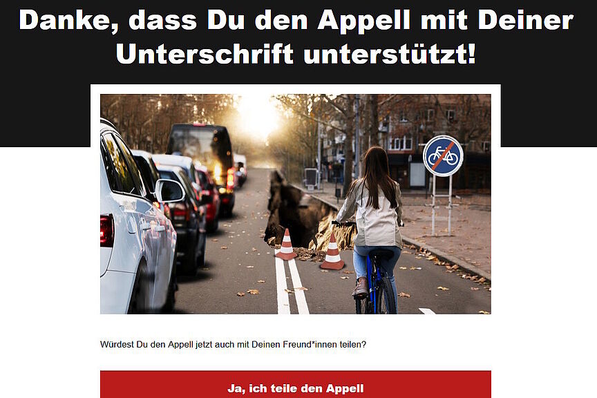 Im Haushaltsentwurf des Bundes für 2024 sollen die Ausgaben für Verkehr um 8% erhöht, die Ausgaben für Radwege auf 50% gekürzt werden. Schon über 165.000 Menschen haben die online-Petiton von Campakt! gegen die Kürzungen unterschrieben.