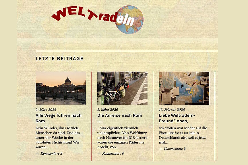 Seit Ende Februar sind sie unterwegs: die Mitglieder des ADFC-Wolfsburg, Karin Klaus-Witten und Fritz Witten. Beiden “ist es ist es zu kalt in Deutschland” und deswegen haben sie sich am 24.2. auf den Weg nach Italien gemacht. Zunächst mit dem Zug und ab Rom mit dem Rad nach Sizilien und zurück. “Plan ist, die Westküste runter nach Süden bis zur Stiefelspitze, Sizilien umrunden, zurück und über Kalabrien, Apulien und die Ostküste wieder nach Norden, soweit wir kommen”, so Fritz. In ihrem Blog 'Weltradeln' berichten sie über ihre Erlebnisse und posten Fotos, dass man neidisch werden kann.